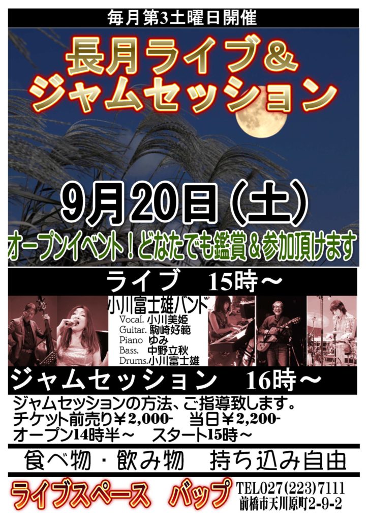 9月20日(土)午後3時より、バップにてライブ&ジャムセッションを開催致します。