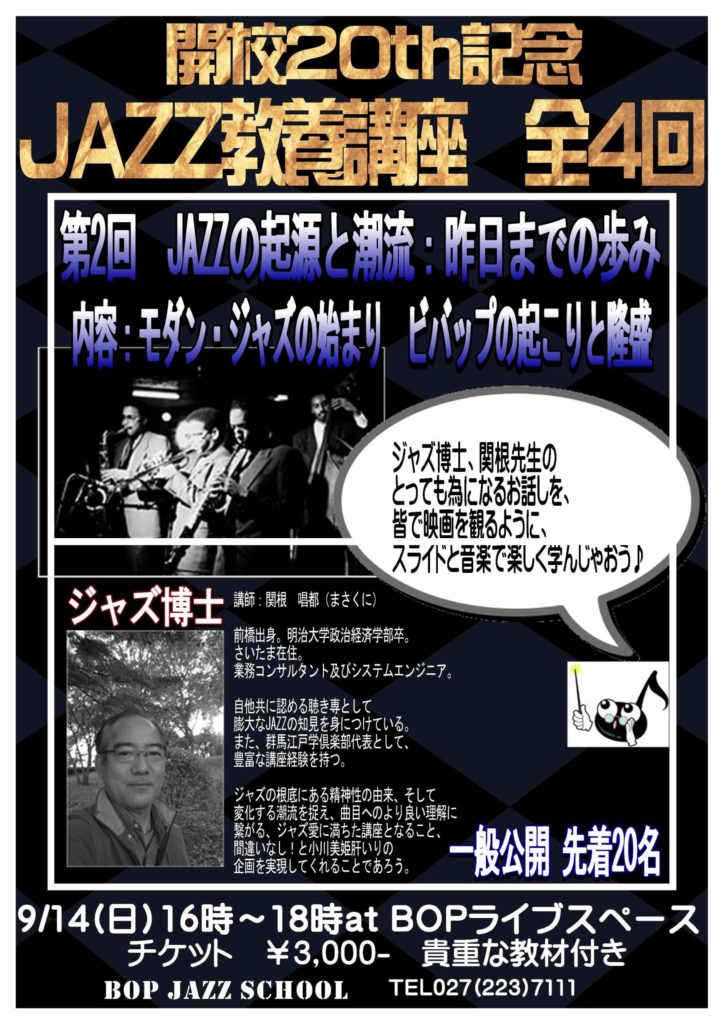 スクール開校20周年記念企画として、ジャズスクールならではのJAZZ教養講座を開講致します。全4回のシリーズもので、第2回目は「ジャズの起源と潮流:昨日までの歩み」と題して、モダンジャズの始まり、ビバップの起こりと隆盛、をご説明。9月14日(日)午後4時からスクールにて開催します。チケット¥3000-(非売・講師手作り資料付き)先着20名。要予約。スクリーンに多様な資料を写しながら、さながら映画を観ているような楽しさと、知らなかった意外な歴史を知る満足感でいっぱいの楽しい内容となっております。講師は関根唱都氏。食費を切り詰めてもジャズのレコードを買って聴いていた、自他共に認めるスーパー聴き専。これは本当に楽しみですね!オープンイベントですので、どなたでも聴講して頂けます。電話027-223-7111 info@bopjazzschool.com