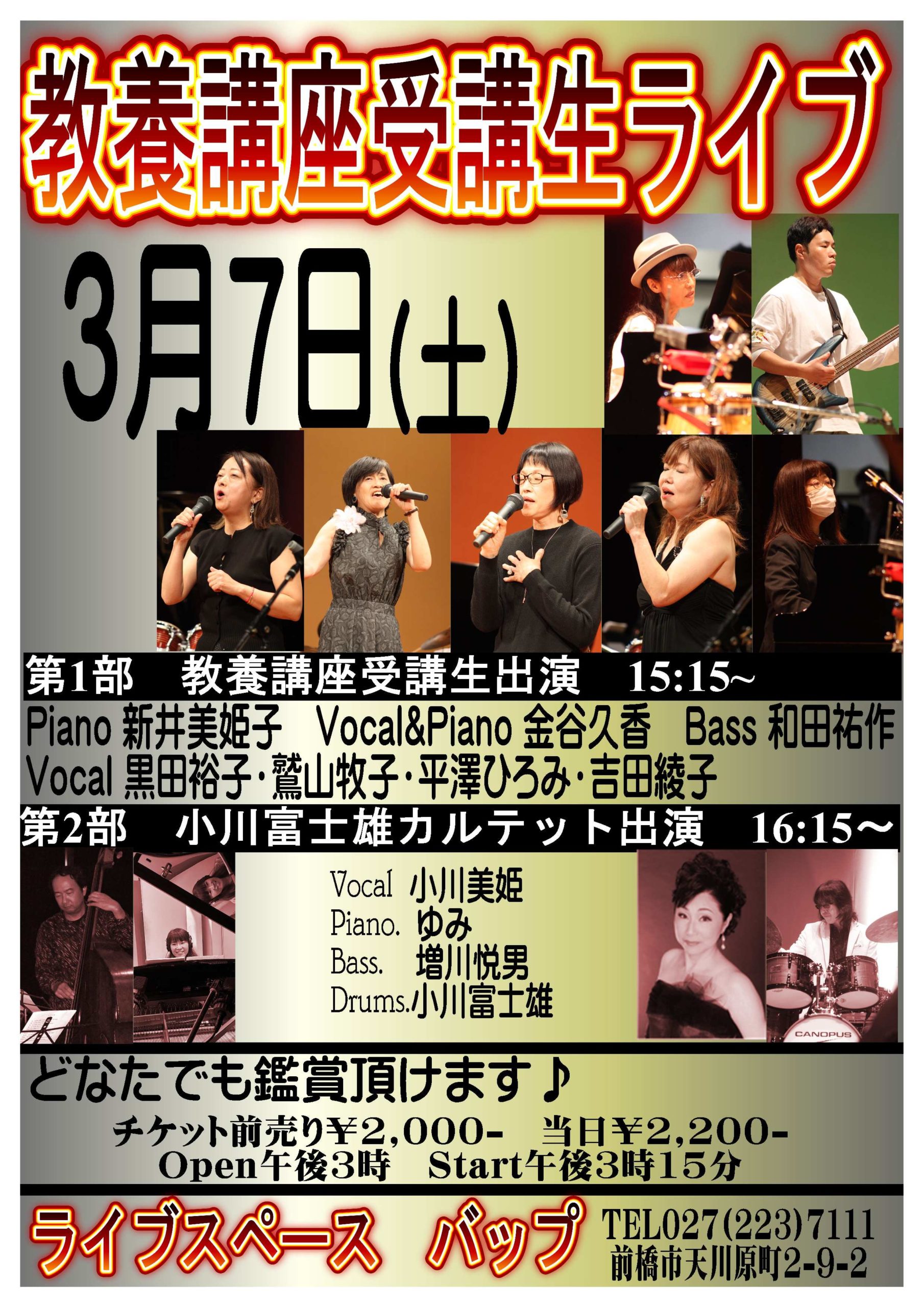 昨年開催したジャズ教養講座を受講した生徒の中から7人が出演するライブを開催します♪午後3時から。チケット前売り¥2000- 当日¥2200- 尚、この日はスクール説明会も開催しますので、そちらに参加してくれた方は無料でライブも聴いて頂けます!どうぞ、お誘い合わせの上、ジャズライブにいらしてください。第Ⅱ部では校長である小川富士雄のカルテットでライブも行います♪